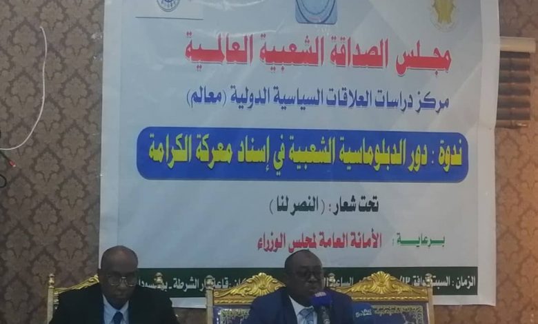 فيما اشارت الاستاذة سلوي محمد محجوب الامين العام لمجلس الصداقة الشعبية العالمية الي دور الدبلوماسية الشعبية في معركة الكرامة عبر التاثير علي الراي العام وقد ظهر ذلك من خلال وقفات السودانيين والجاليات الاخري مع السودان بالخارج من خلال المسيرات والمبادرات وكان للاعلام المساند دور بارز في تلك المعركة .