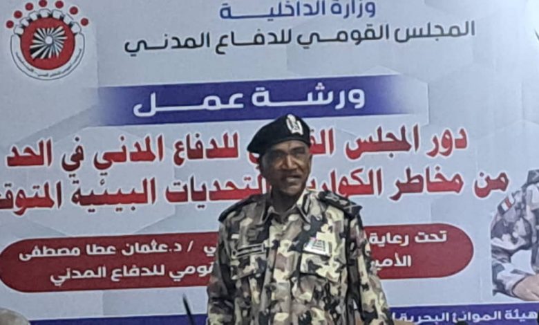 في اطار اهتماماته بحماية البئية والحد من مخاطر الكوارث عقد المجلس القومي للدفاع المدني ورشة عمل بقاعة بانوراما برئاسة هيئة الموانئ البحرية وقد كانت برعاية الفريق شرطة حقوقي دكتور عثمان عطا مصطفي الامين العام للمجلس القومي للدفاع المدني بحضور شركاء الدفاع المدني في المجال البيئي وكانت الورشة بعنوان دور المجلس القومي للدفاع المدني في الحد من مخاطر الكوارث والتحديات البيئية المتوقعة .