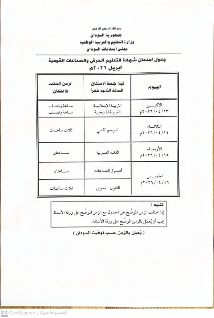 اعلنت وزارة التربية والتعليم الاتحادية جدول امتحانات الشهادة الثانوية لدفعة 2026م والتي من المقرر أن تعقد في الثالث عشر من ابريل القادم علي أن تبدأ الجلسات عند الساعة الثانية ظهراً وفيما يلي تورد يقين برس جداول الامتحان للمساقات المختلفة